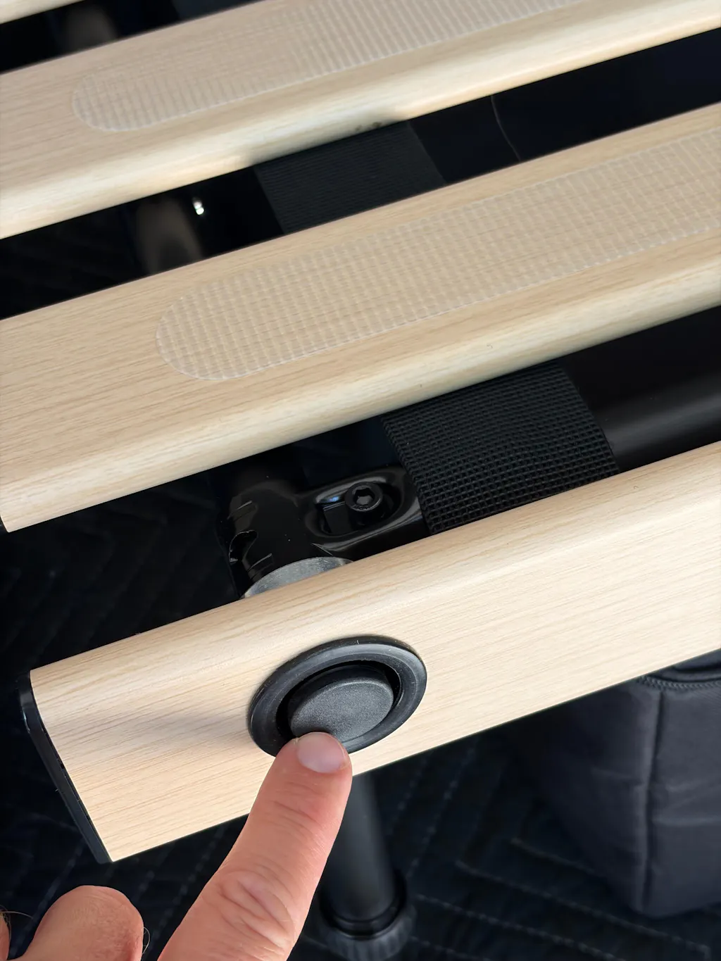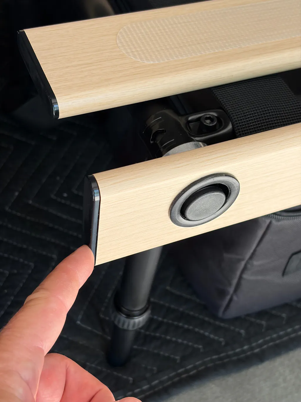 If you are using the Hele Box in an SUV, a set of longer adjustable legs are attached to the front of the frame. These legs sit in the footwell of the rear seating and level out the frame with the other 4 shorter legs in the rear of the frame.